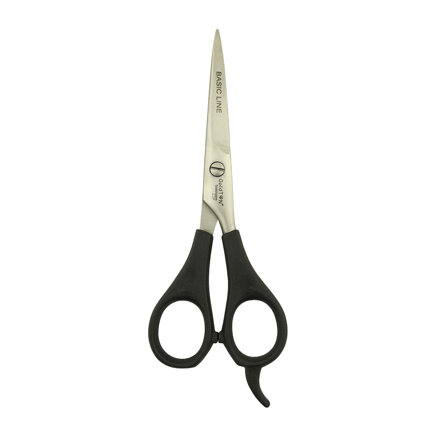 Nożyczki Fryzjerskie basic line 5'' firmy GoldTon wykonane są ze stali wysokowęglowej. Satynowe wykończenie i czarne rączki nadają nożyczkom klasyczny wygląd. Stworzone z myślą dla osób początkujących.
