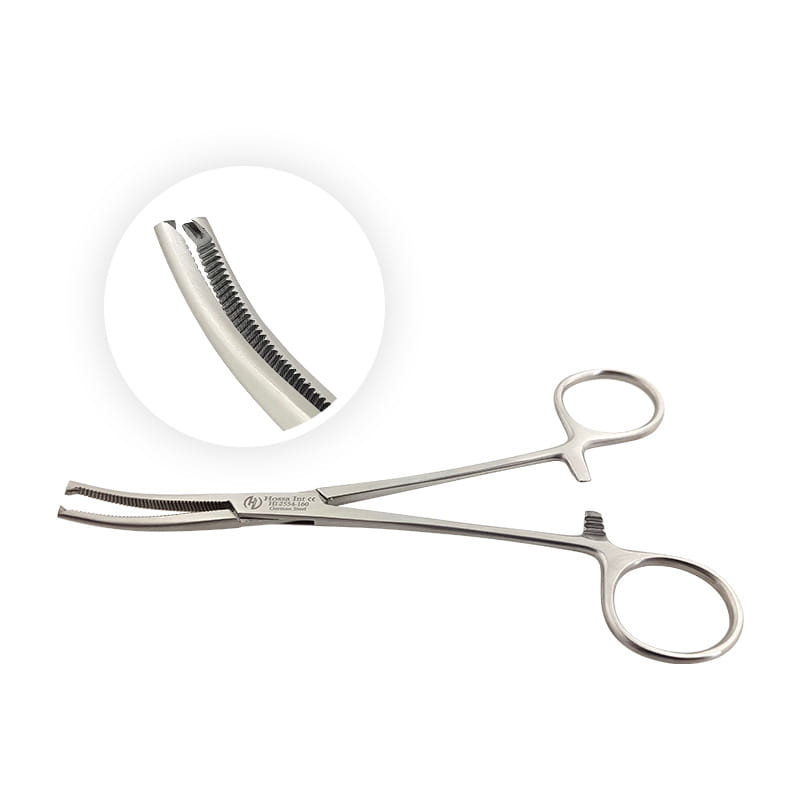 Kleszczyki Kochera z ząbkami 1x2 16 cm marki Hossa International to zagięte kleszczyki naczyniowe, chirurgiczne stosowane do zamknięcia światła naczynia krwionośnego i zahamowania treści wewnątrz. Kleszcze chirurgiczne Kochera należą do tzw. kleszczy twardych, szczękowych używanych m.in. w chirurgii ogólnej, ginekologi oraz położnictwie, gdzie po jednej stronie znajdują się dwa ostre ząbki, a po drugiej jeden, a na całości końcówki roboczej występują poprzeczne rowkowania. Posiadają system samozaciskowy z 4-stopniową zapadką.