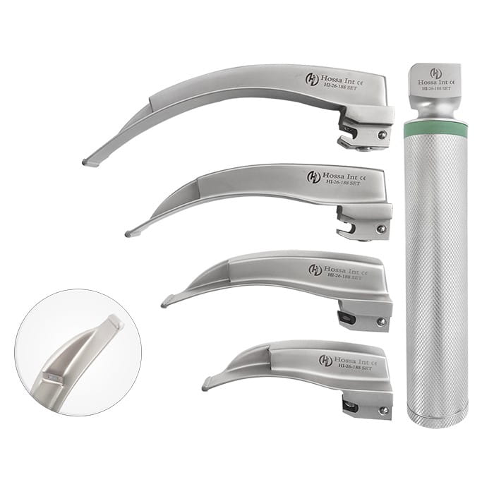Specjalistyczny zestaw do intubacji: Łyżki laryngoskopowe światłowodowe typ Macintosh Mega Blade w rozmiarach 1,2,3,4 z uchwytem LED Mega Light.