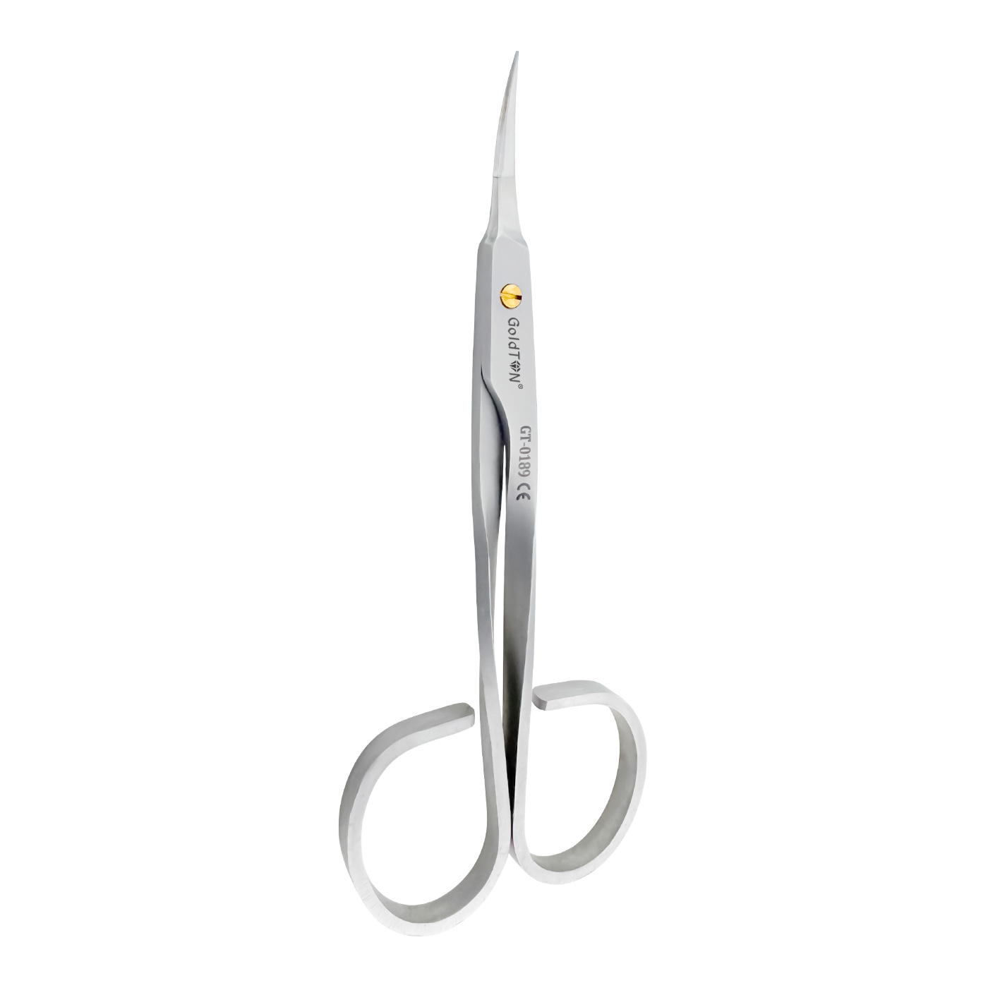 Nożyczki GoldTon posiadają zagięte ostrza oraz wydłużony uchwyt, które umożliwiają obcięcie skórek w trudno dostępnych miejscach. Wyprofilowana część pracująca zapobiega zacinaniu skórek, a śruba łącząca ramiona utrzymuje odpowiednie naprężenie nożyczek. Nożyczki o satynowym wykończeniu zapobiegającym refleksom świetlnym, zmatowione oraz poddane pasywacji, co wyeliminowało związki niklu na ich powierzchni.
